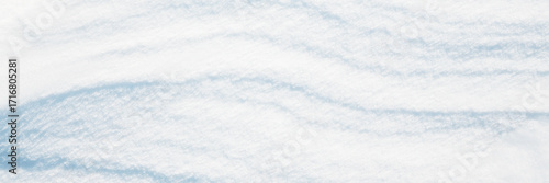 © Andrei Stepanov, Obraz premium Wide panoramic winter background with snowy ground. Natural snow texture. Wind sculpted patterns on snow surface.