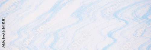 Fototapeta premium Wide panoramic winter background with snowy ground. Natural snow texture. Wind sculpted patterns on snow surface.