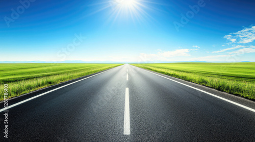 Naklejka premium Wide road into distance, flanked by green fields and blue sky. High-definition, horizontal composition. Serene beauty.
