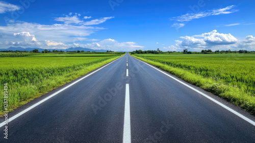 Naklejka premium Wide road into distance, flanked by green fields and blue sky. High-definition, horizontal composition. Serene beauty.