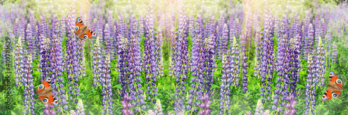 Fototapeta premium Wide-screen unfocused background with blooming lupines and butterflies. Art design, banner
