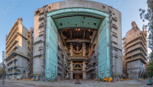 Obraz premium Wide shot of a large, industrial facility with open doors