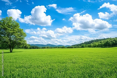 © third, Obraz premium Wide shot of a vibrant green field under a clear blue sky with fluffy white clouds. A lone tree stands in the foreground