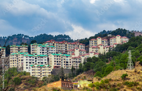 Obraz premium wide shot of buildings along side hills and cloudy blue sky in the background