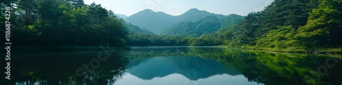 Naklejka premium Wide shot of the reflective waters of Myojin Pond, with vibrant green forests and distant peaks creating a cinematic backdrop, in 4K resolution