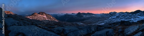 Obraz premium Wide shot of Trolltunga at twilight. with the last rays of sunlight casting a warm glow on the rock and the surrounding mountains. in 4K resolution