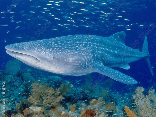 Naklejka premium wide shot photograph of a massive whale swimming peacefully in the ocean, with a school of tiny, shimmering fish swimming alongside it, vast blue water,