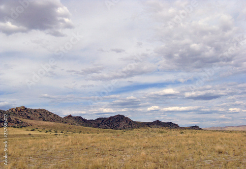 Fototapeta premium Wide steppe with yellow grass under a blue sky with white clouds Sayan...