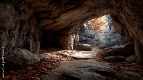 © Aisha, Obraz premium wide stone cave opening with rough natural textures and scattered dry leaves