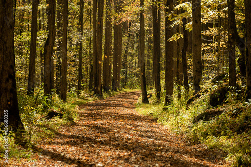 Obraz premium Wide Trail in Fall with Leaves Falling Down