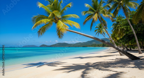 Fototapeta premium Wide tropical beach with leaning palms, white sand and crystal clear blue water under bright sky, scenic island coastline
