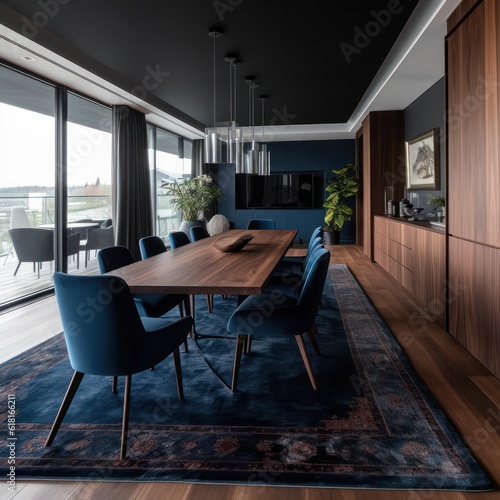 Fototapeta premium Wide View of a Luxurious Dining Room with a Long Table, Elegant Chairs, and...