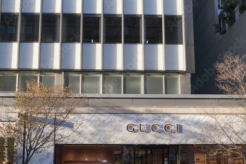 Naklejka premium wide view of building and sign outside Gucci, a boutique with luxury brand...