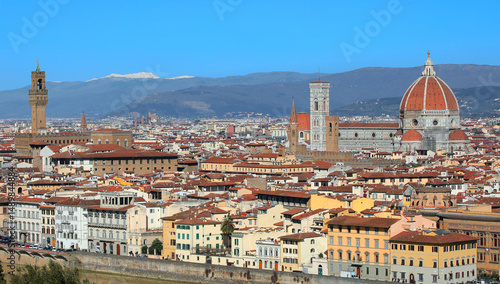 © ChiccoDodiFC, Fototapeta premium Wide view of Florence in Central Italy with many famous landmarks like Tower of OLD Palace and the Big Dome of The Cathedral