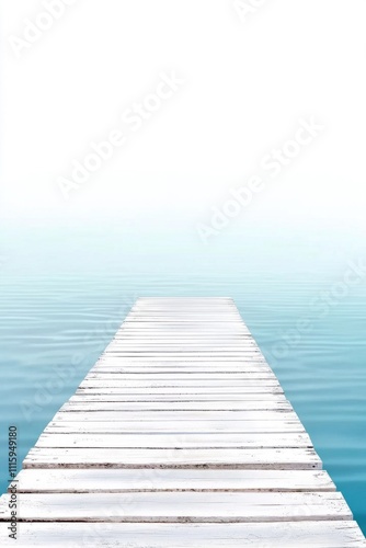 © SERHII, Obraz premium Wide wooden pier extending into tranquil blue sea under clear sky