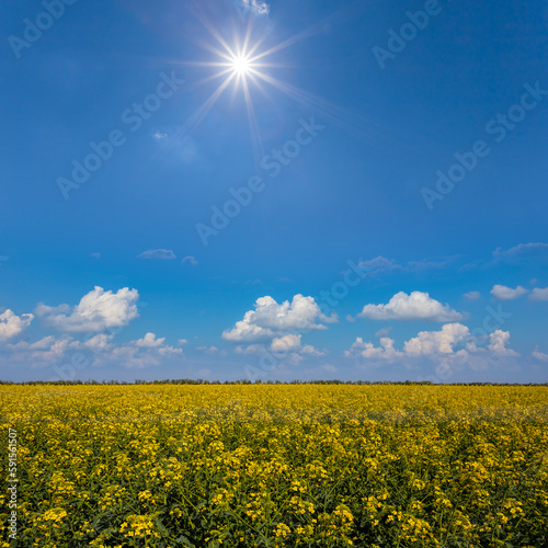 © Yuriy Kulik, Obraz premium wide yellow rape field at hot summer sunny day