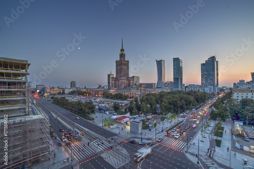 © bartsadowski, Obraz premium Widok centrum Warszawy bez rozpoznawalnych logo.