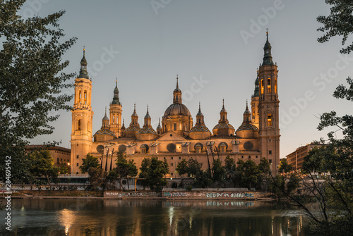 Obraz premium Widok na Bazylikę Pilar i rzekę Ebro w Saragossie, Hiszpania.