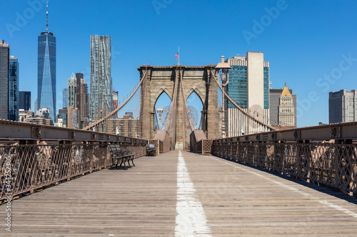 © Kathy images, Fototapeta premium Widok na dolny Manhattan z pustego chodnika dla pieszych na moście Brooklyn w Nowym Jorku.