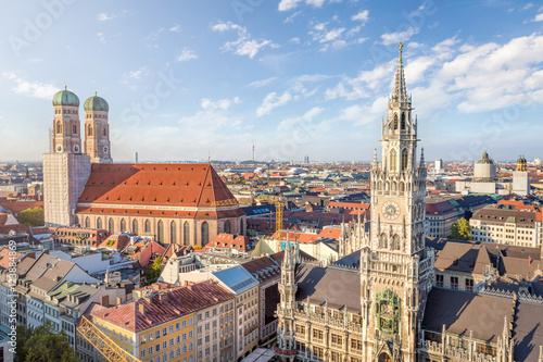 Fototapeta premium Widok na Monachium Marienplatz z ratuszem i kościołem Frauenkirche, Bawaria,...