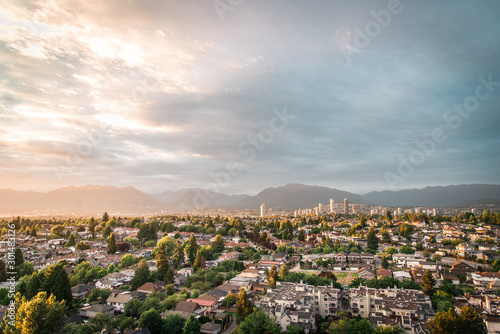 © Olessia, Obraz premium Widok na niebo w East Vancouver i Brentwood, Burnaby z tłem gór podczas i epicki letni zachód słońca