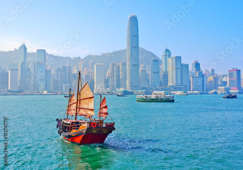 © Javen, Obraz premium Widok na panoramę Hongkongu z czerwoną chińską żaglówką przechodzącą na Port Wiktorii w słoneczny dzień.