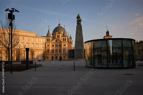 © Jacek, Obraz premium widok na Plac Wolności w Łodzi z pomnikiem Tadeusza Kościuszki i zabytkowym kościołem