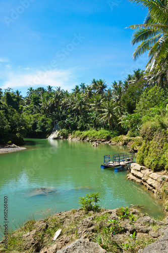 © gunaonedesign, Fototapeta premium Widok na rzekę w wodospadzie Sri Gethuk, Yogyakarta, Indonezja