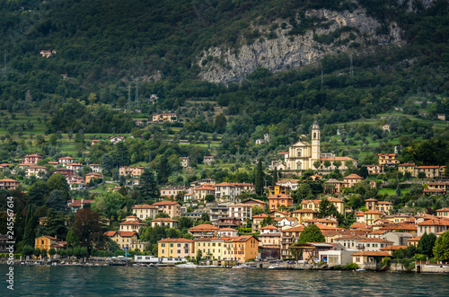 Fototapeta premium Widok na wieś w lesie w jeziorze Como z promu o zachodzie słońca, Jezioro...