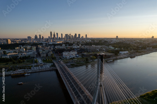 © Arkadiusz, Fototapeta premium Widok na wieżowce w centrum Warszawy o zachodzie słońca, złota godzina, nad mostem świetokrzyskim