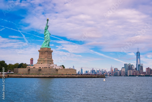 Obraz premium Widok na wodę na rzekę Hudson, panoramę Manhattanu i jego wieżowce oraz wyspę i Statuę Wolności, latem bardzo popularne miejsce wśród turystów z całego świata