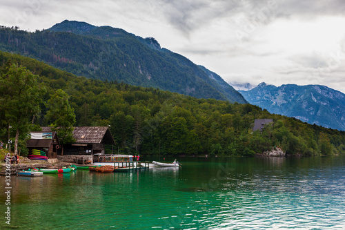 © bepsphoto, Naklejka premium Widok na wypożyczalnię łodzi na jeziorze Bohinj