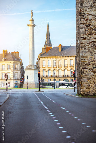 Naklejka premium Widok ulicy na powierzchnię Marechal-Foch z kolumną Louisa podczas zachodu słońca w mieście Nantes we Francji