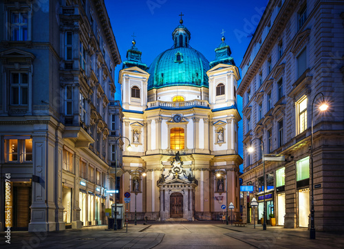 © Tryfonov, Fototapeta premium Widok wieczornego kościoła św. Piotra w historycznym centrum miasta. Wiedeń, Austria.