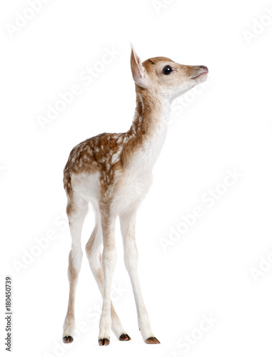 © Eric Isselée, Fototapeta premium Widok z boku Jelonek Daniele, Dama dama, 5 dni, stojąc na białym tle, łapka