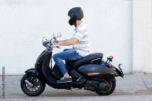 © mimagephotos, Obraz premium Widok z boku młodego człowieka w kasku, jazda na skuterze na drodze