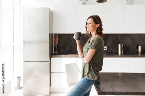 © Drobot Dean, Fototapeta premium Widok z boku uśmiechnięta dorywczo kobieta pije kawę w kuchni