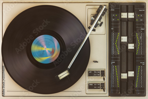© Martin Bergsma, Obraz premium Widok z góry na vintage gramofonu w stylu retro