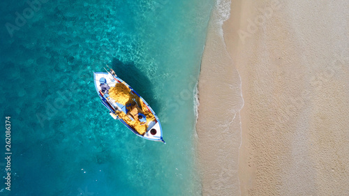 © aerial-drone, Fototapeta premium Widok z góry z drona z lotu ptaka Zdjęcie czerwonej drewnianej tradycyjnej łodzi rybackiej na turkusowym brzegu morza na wyspie Zakynthos, Jońskie, Grecja