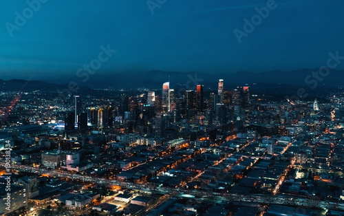 Fototapeta premium Widok z lotu ptaka centrum Los Angeles o zmierzchu z młodą kobietą, trzymając...