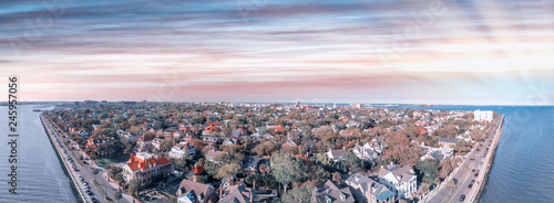 Obraz premium Widok z lotu ptaka Charleston o zmierzchu, Karolina Południowa, USA