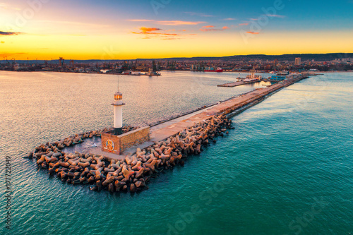 © ValentinValkov, Obraz premium Widok z lotu ptaka latarnia morska przy zmierzchem w Varna, Bułgaria