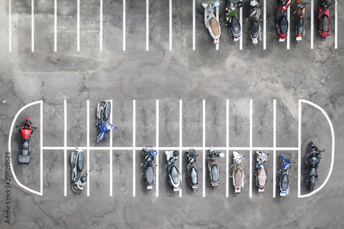 © ekapolsira, Naklejka premium Widok z lotu ptaka motocykli parkingu na betonowej podłodze.