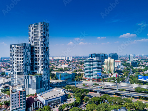 © AkhmadDody, Obraz premium Widok z lotu ptaka na gród Dżakarty z błękitne niebo