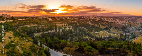 © tamas, Fototapeta premium Widok z lotu ptaka na Jerozolimę ze starym miastem i zachodnią częścią, Rehavia, Abu Tor i Talpiyot