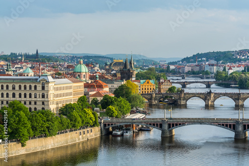 © zz3701, Naklejka premium Widok z lotu ptaka na miasto Citycape na starym mieście w Pradze, z wieloma dachami, kościołami i symbolem Mostu Karola i Wełtawy.