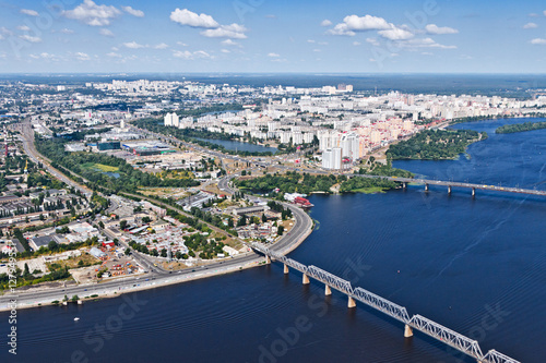 © Oleg Totskyi, Obraz premium Widok z lotu ptaka na miasto Kijów (Kijów), Ukraina. Dniepr z mostami. W tle dzielnica Obolon