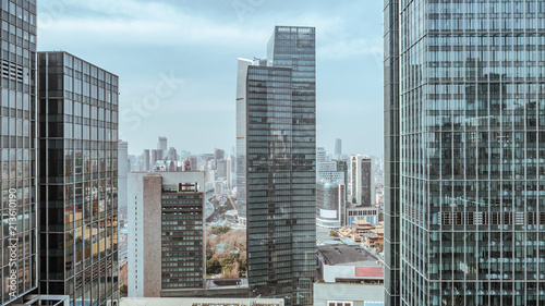 © Bob, Obraz premium Widok z lotu ptaka na obszar biznesowy i panoramę miasta w zachodniej części drogi Nanjing, dzielnica Jing`an, Szanghaj