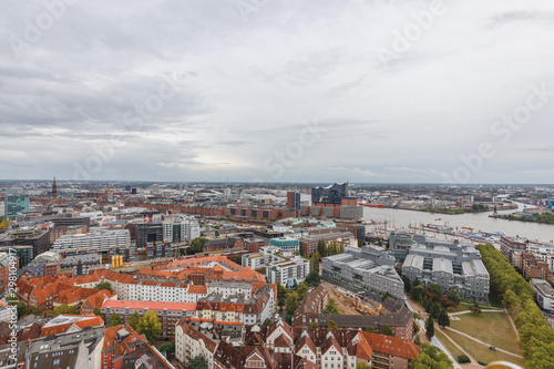© Sen, Obraz premium Widok z lotu ptaka na widoki miasta Hamburga w pochmurny dzień, Hamburg, Niemcy