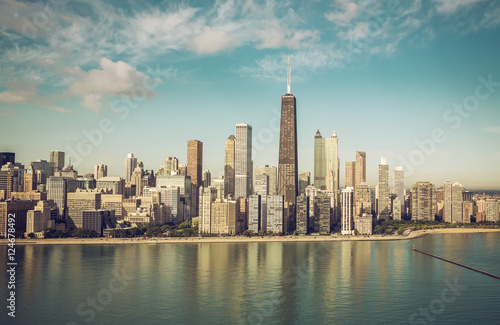 Fototapeta premium Widok z lotu ptaka - panoramę Chicago Downtown i wieżowce, kolory vintage